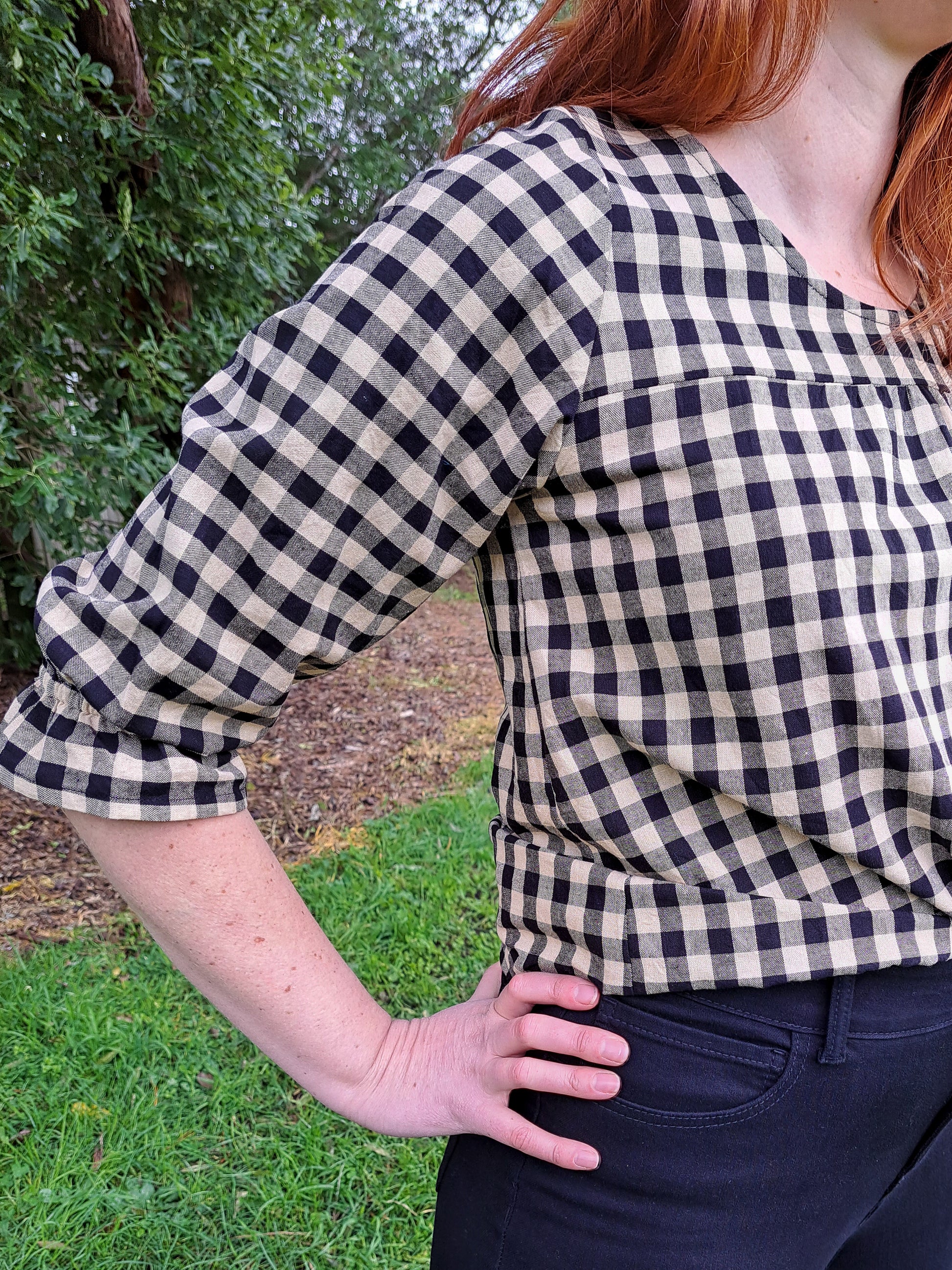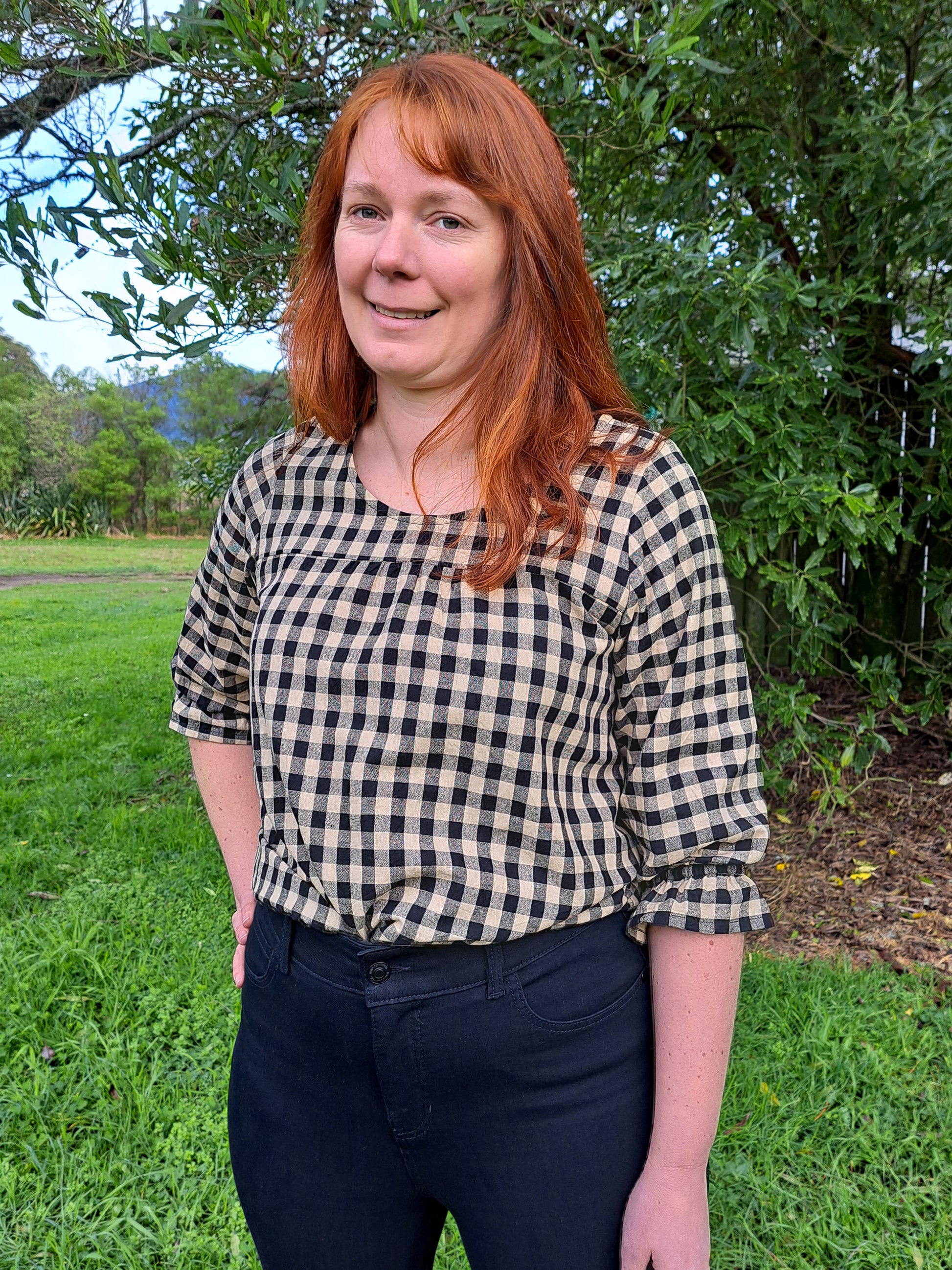 The Jacqui blouse features 3/4 sleeves gathered with elastic just above the hem, to create a frill. She has a small amount of gathering above the bust. The bodice is cut with a slight A-line shape which finishes with a curved slight high-low hem at hip length. The back is 10cm longer than the front.
