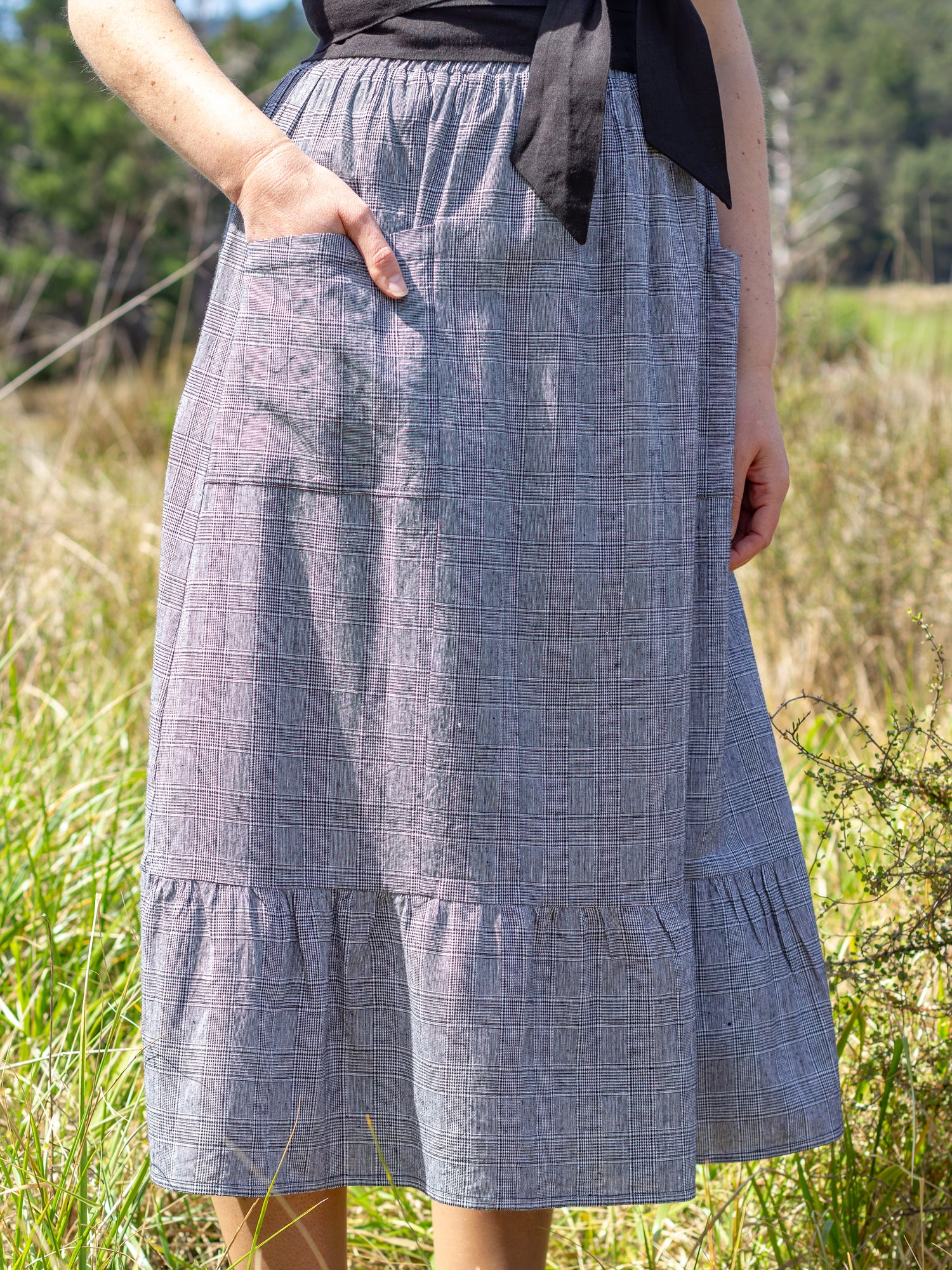 The Millie Maxi Skirt features two deep front pockets, you can definitely fit your phone in those! She has a wide elastic waist band, and a gathered frill on the bottom.