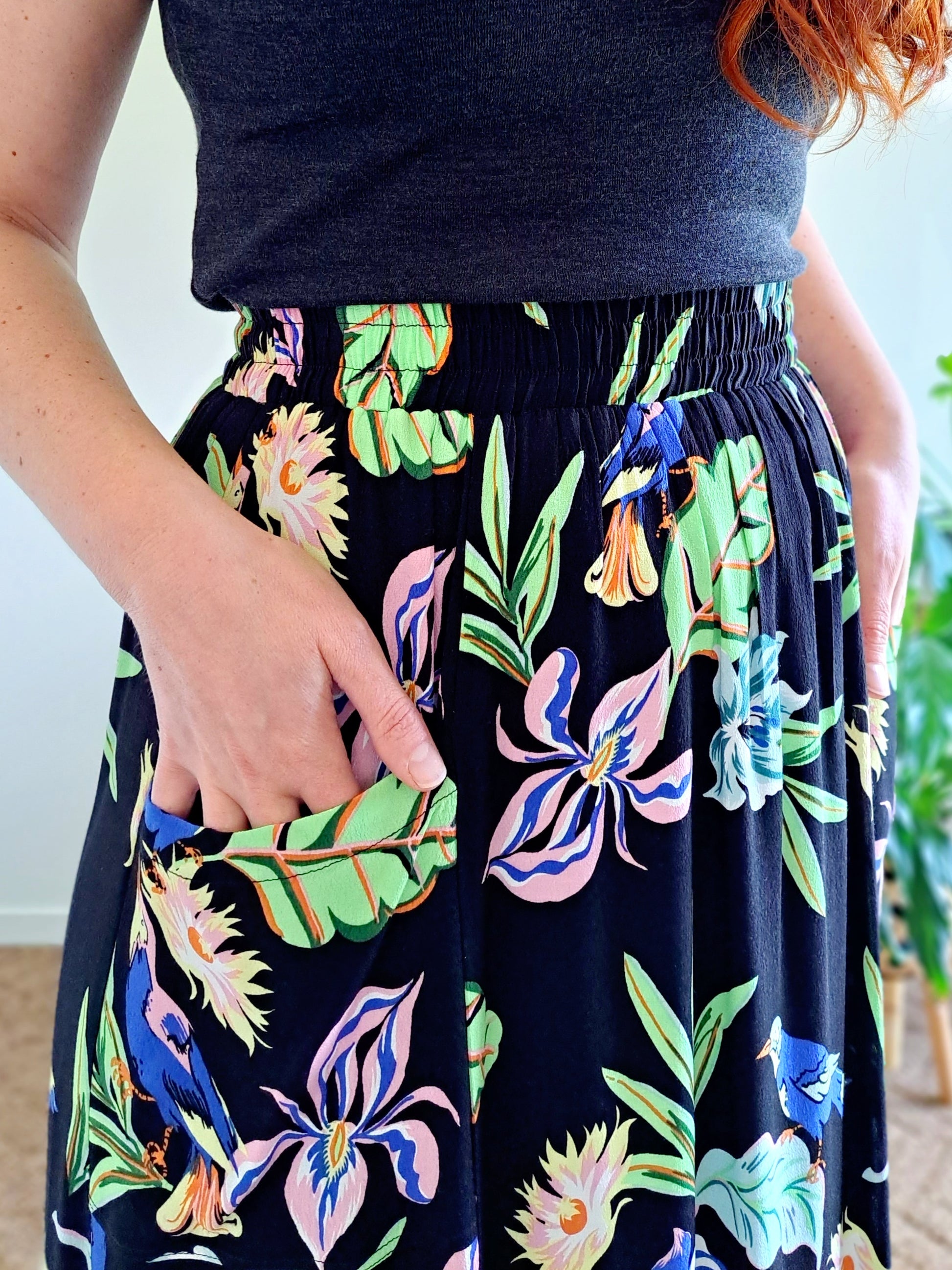 The Millie Maxi Skirt features two deep front pockets, you can definitely fit your phone in those! She has a wide elastic waist band, and a gathered frill on the bottom.