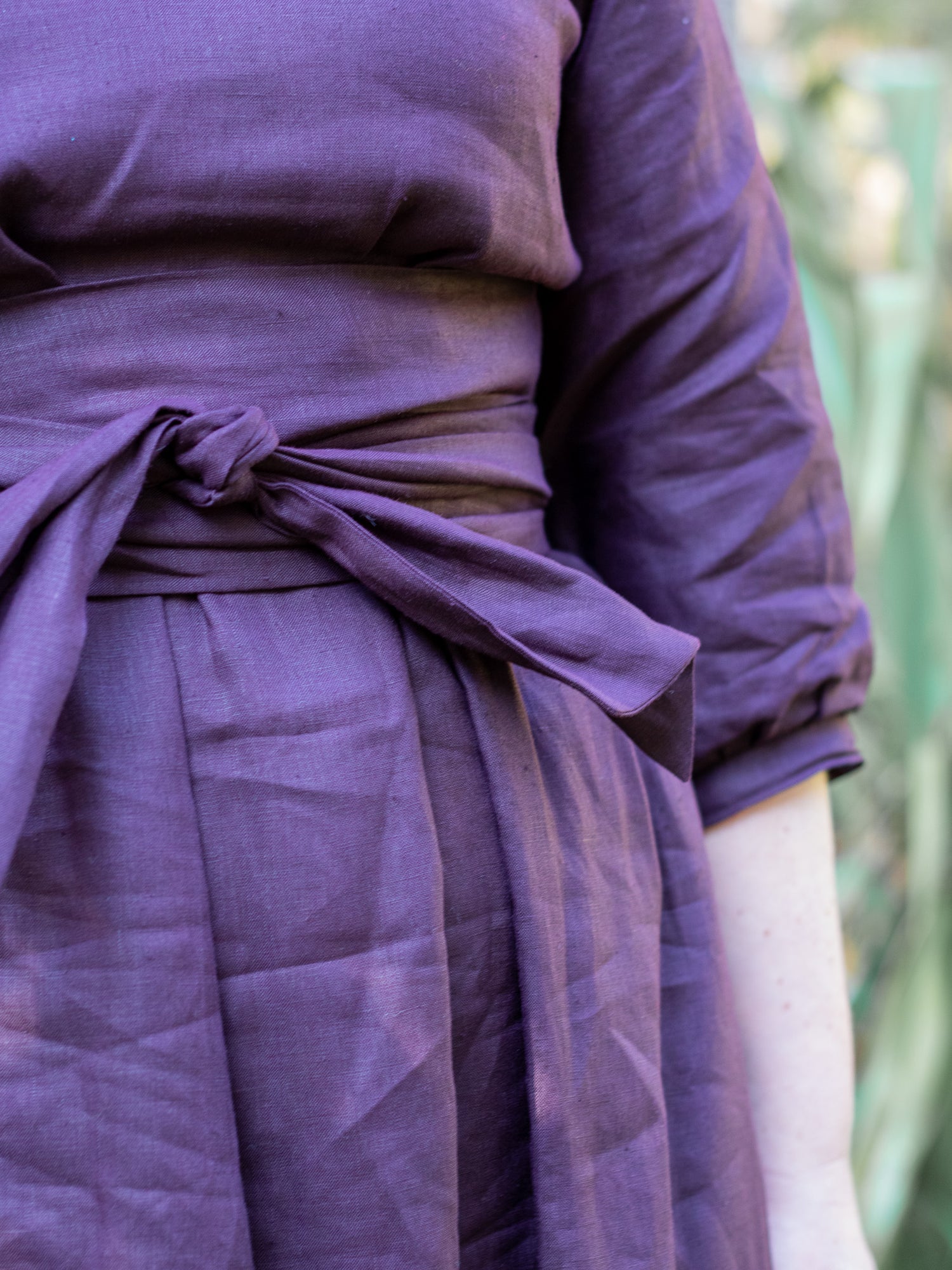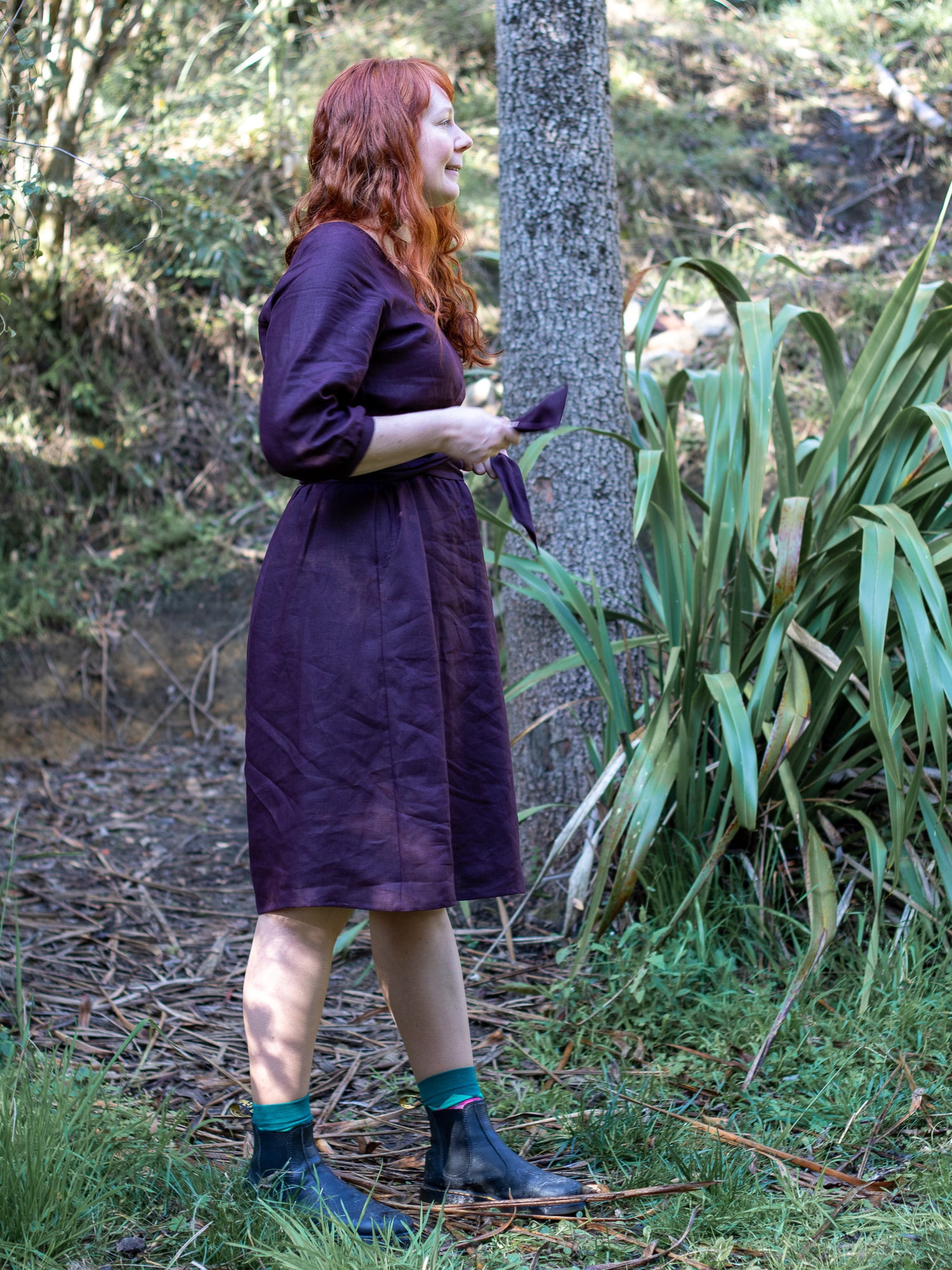 Look 1: Darla wears a Mollie Dress made out of aubergine linen, with waist ties pulled around the front first, then back, then pulled back around to front and tied in a knot.