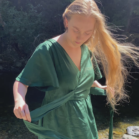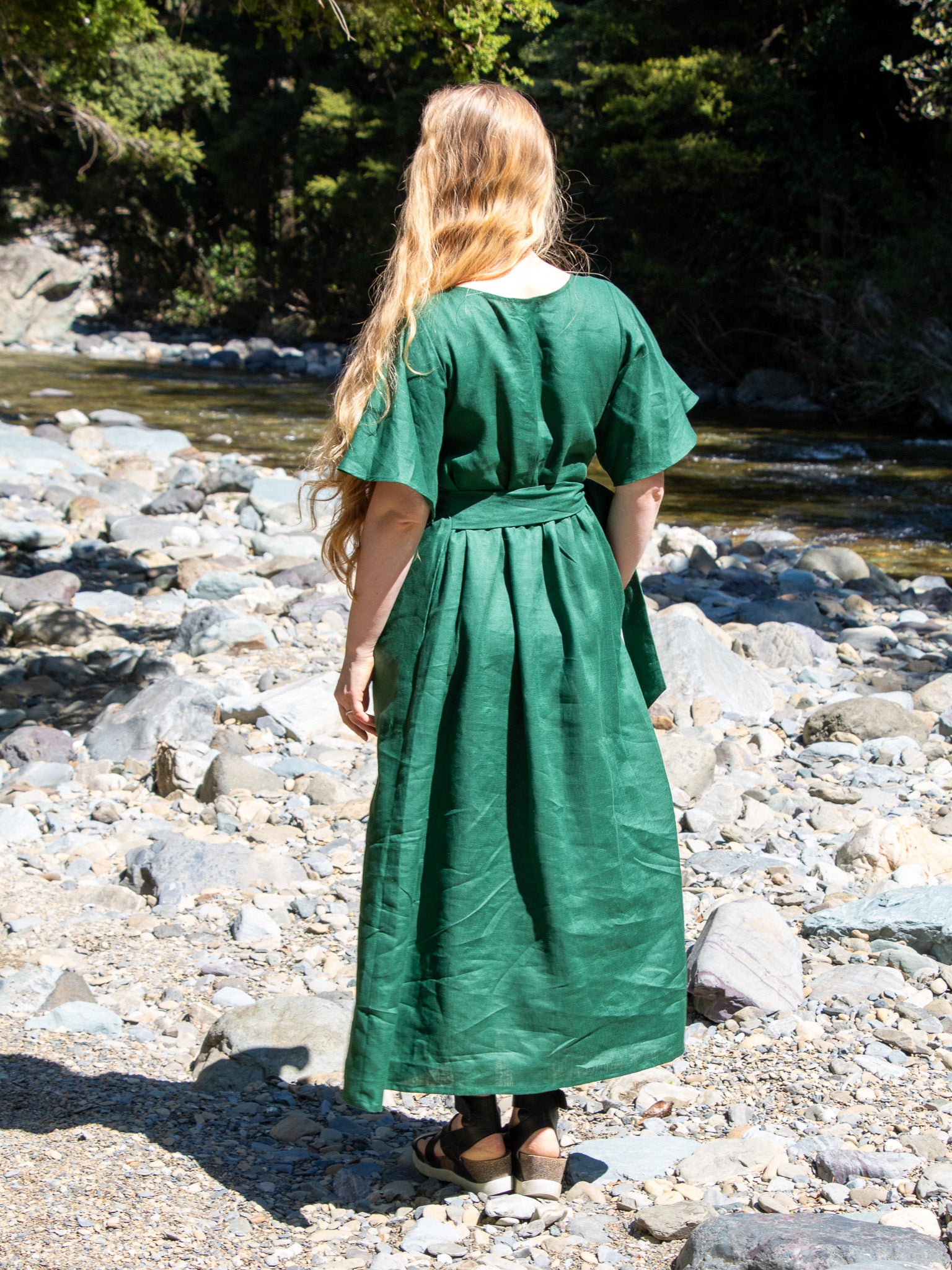 Maniana wears a Kelsey Dress made out of bottle green linen.
