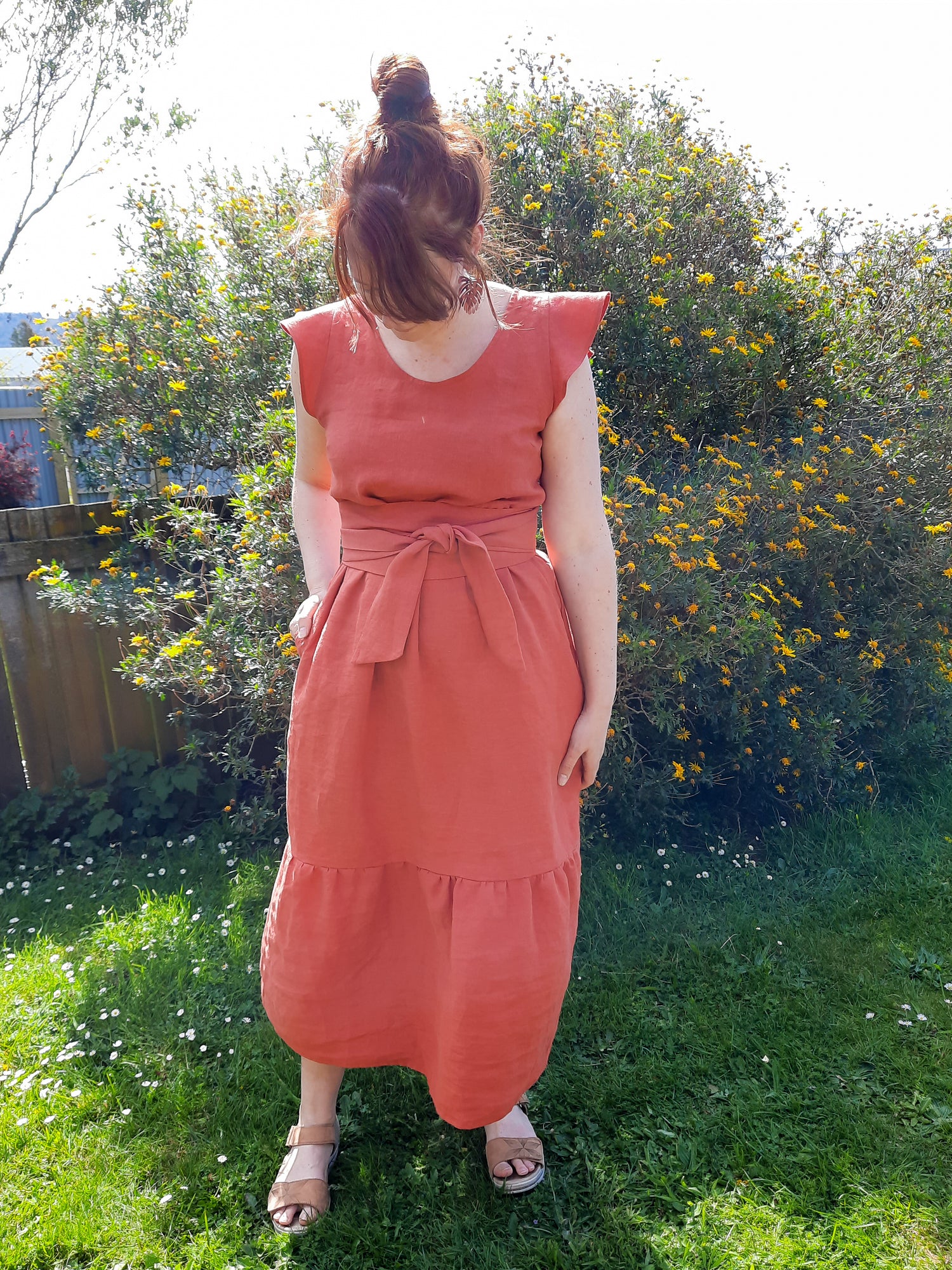 The Mollie dress features long wide waist bands attached in the side seams, that can be wrapped around multiple times, or pulled around the back and tied in a large bow. She has small floaty cap sleeves. The maxi skirt is made out of two gathered tiers, finishing above the ankle. All Dare Darla dresses have pockets in the side seams, with our signature curved opening detail.
