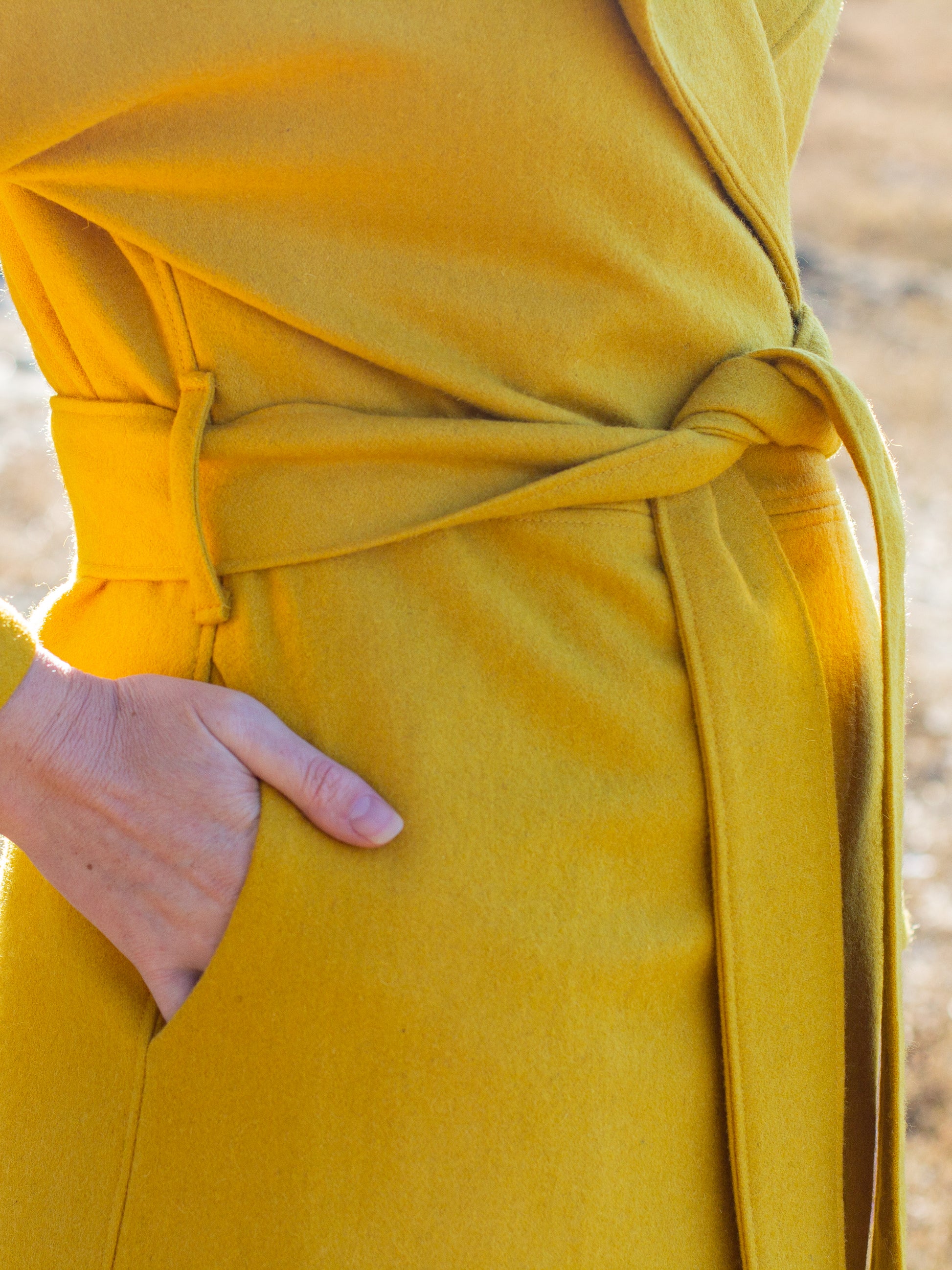Look 2: Darla wears a Niki Coat made out of yellow mustard wool.