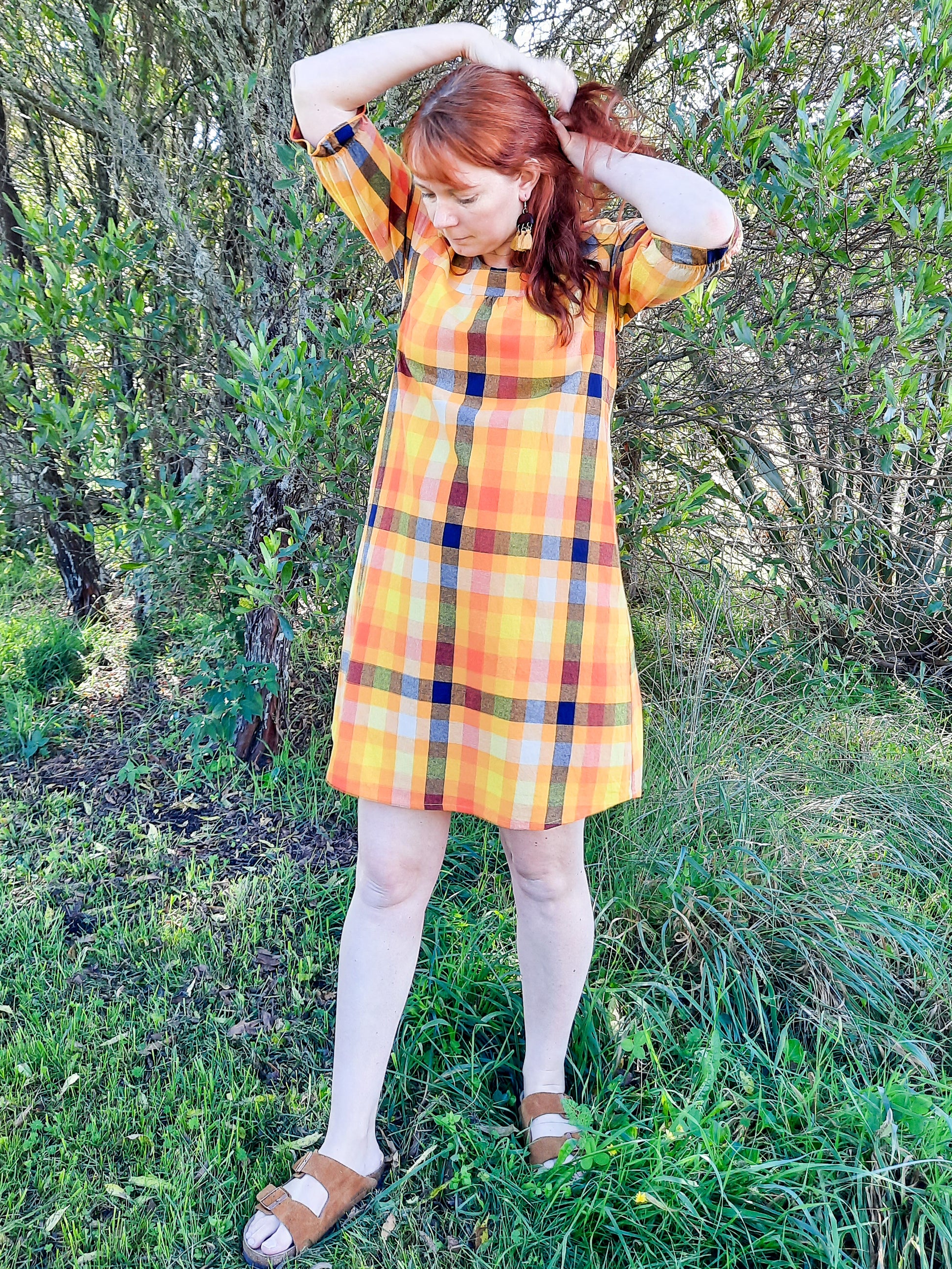 The Phoebe dress features 3/4 sleeves gathered with elastic just above the hem, to create a frill. She has a small amount of gathering above the bust. The bodice is cut with a slight A-line shape which finishes with a slight curved hem at knee length. All Dare Darla dresses have pockets in the side seams, with our signature curved opening detail.