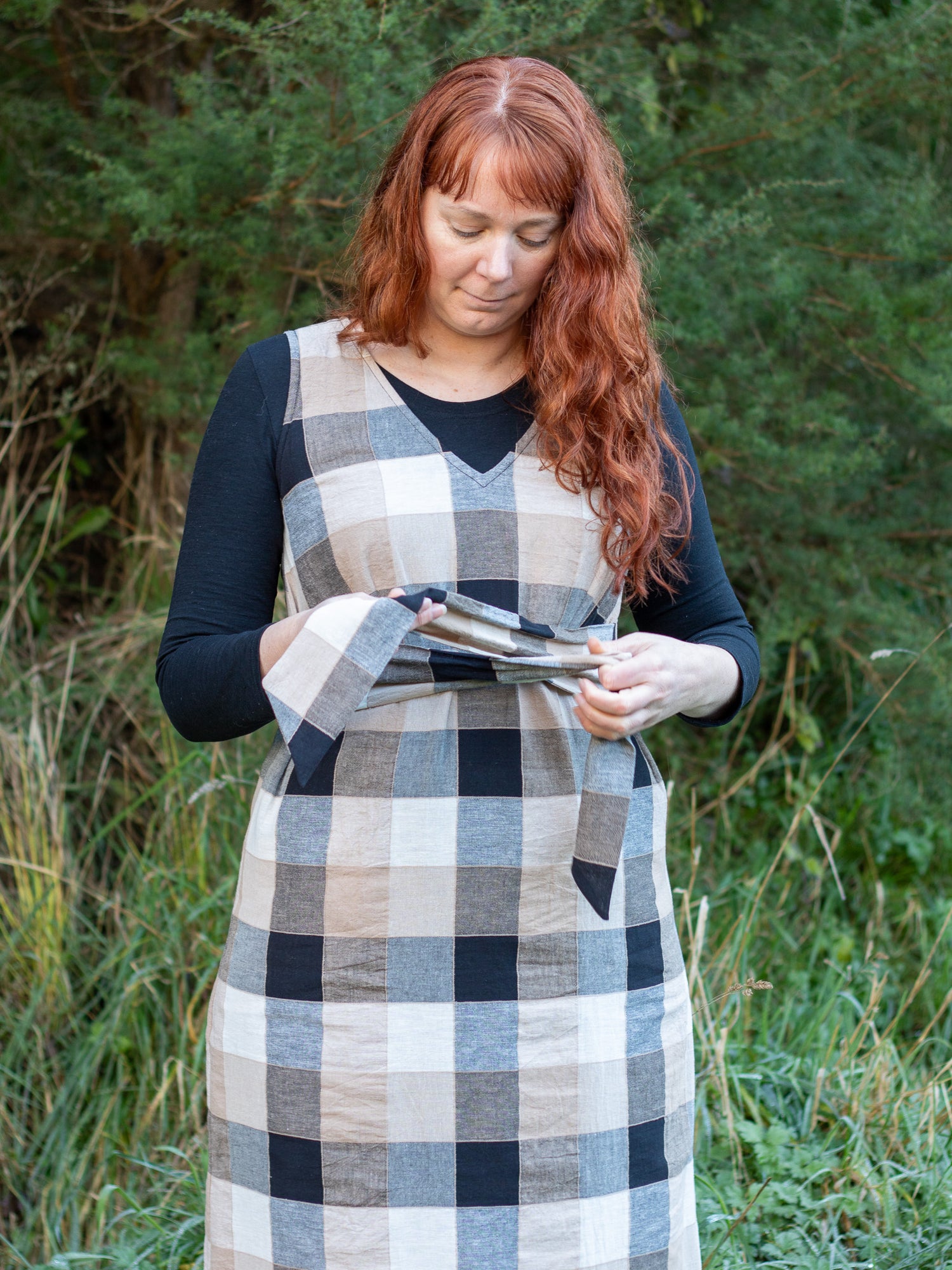 Darla wears the Pinny dress made out of black/beige check in a cotton/linen blend.