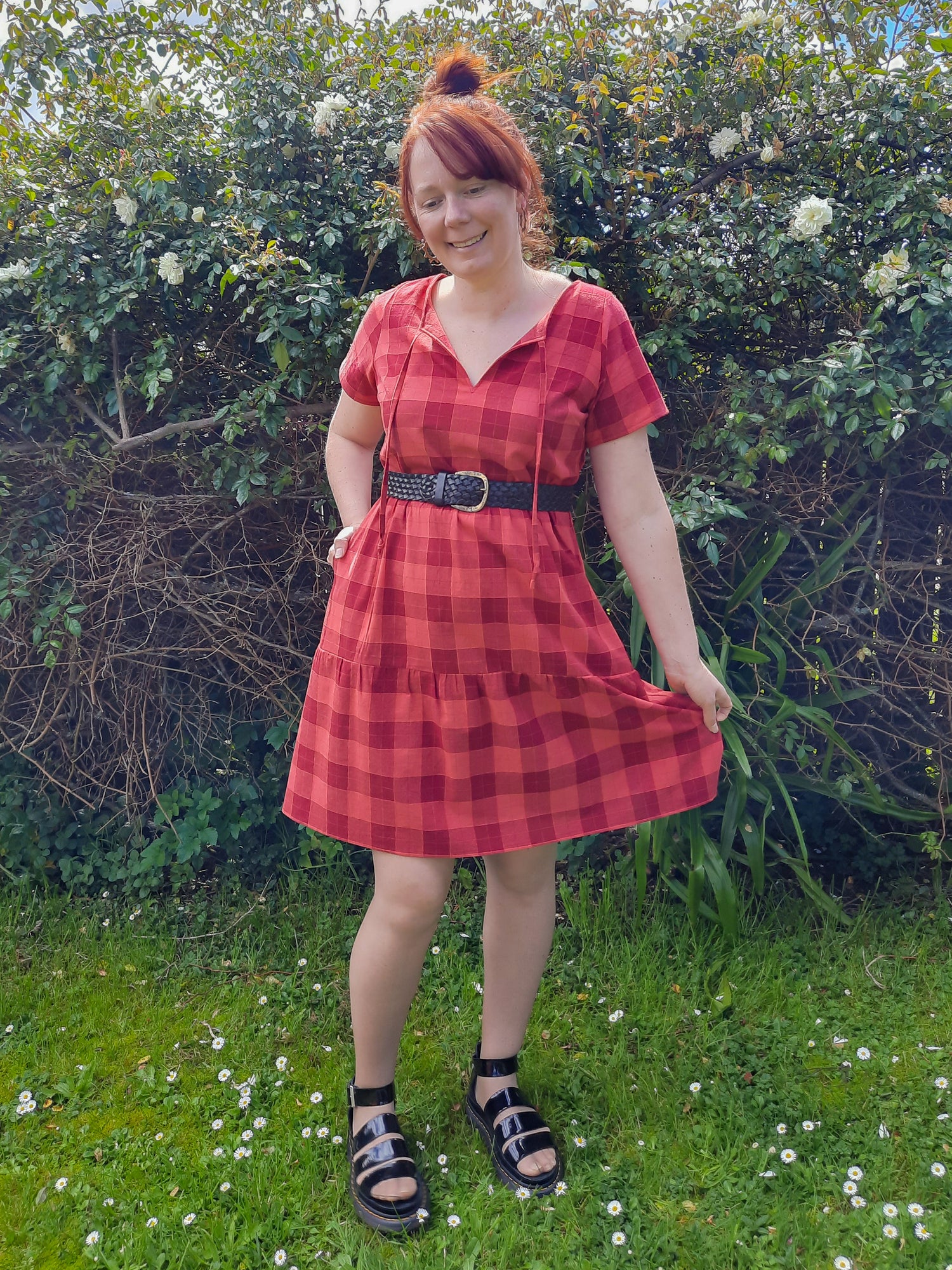 The Sammy dress features a tie neckline, which you can wear open to create a v-neck, or tie closed. She has a pleat in the centre back to give more room in the bust and shoulders. The skirt is made out of two gathered tiers, with a hem just above the knee. All Dare Darla dresses have pockets in the side seams, with our signature curved opening detail.