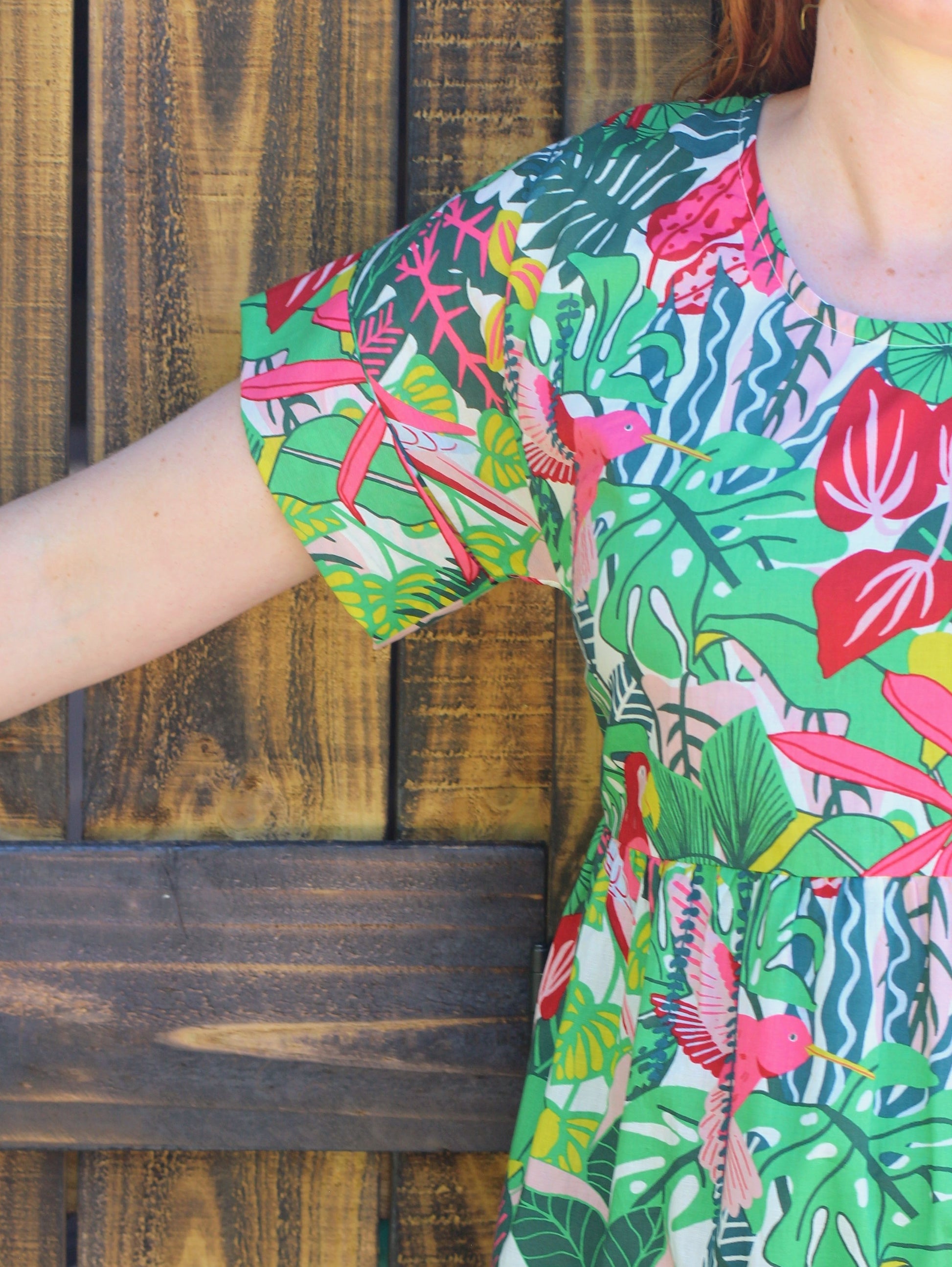 Look 2: Darla wears Stella dress made out of Tropical birds cotton.